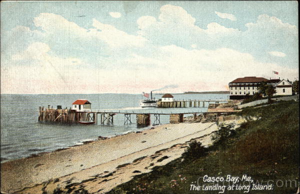 Front: Casco Bay, Me., The Landing at Long Island. Back: THE HUGH C. LEIGHTON CO.. MANUFACTURERS, PORTLAND, ME .U.S.A. FRANKFORT MAIN, GERMANY N 4669 64.25 One Cent for. United States; and island Possessions.. Cuba, Canada and For Foreign