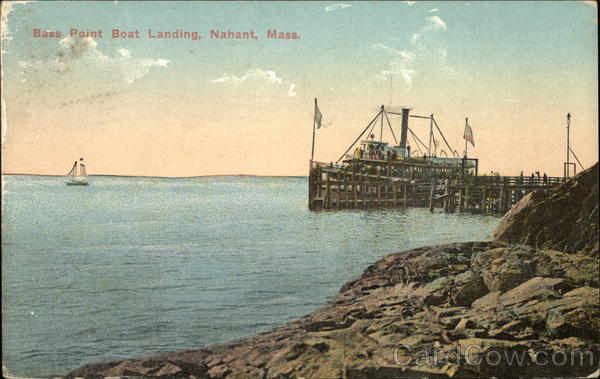 Front: Bass Point Boat Landing, Nahant, Mass. 12: Back: Pub. by Essinger & Cook, Bass Point, Nahant, Mass. JUL 19 7-PM Cc: Bere Sish Dear Cora E E Adams Love from and fish dinner sea breeges I enjoy were 2 GENTS Nors Edgar Mickena Earl Harwich Mass