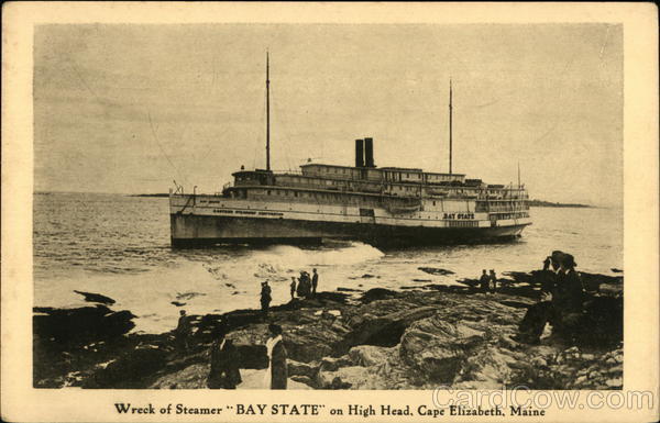 Front: Sie BAT STATE Wreck of Steamer "BAY STATE" on High Head, Cape Elizabeth, Maine Back: Published by John A. Borrows, 404 1-2 Congress St., Portland, Me. 125 1895-1916 HOF