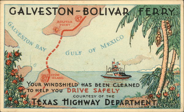 GALVESTON-BOLIVAR FERRY BOLIVAR GALVESTON BA GULF OF MEXICO 3-1 an YOUR WINDshield has BEEN CLEANED TO HELP YOU DRIVE SAFELY ha COURTESY OF THE TEXAS HIGHWAY DEPARTMENT,