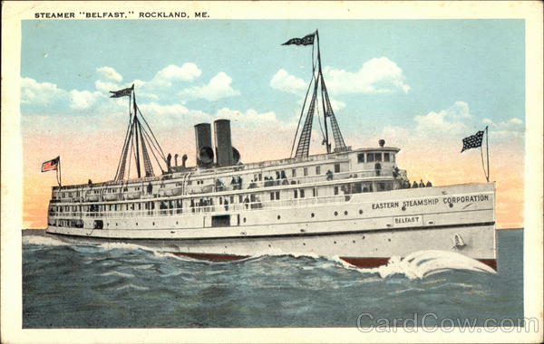 Front: STEAMER "BELFAST," ROCKLAND, ME. COOL EASTERN STEAMSHIP CORPORATION BELFAST Back: 1909- SUBS, ARROW MFD TICHNOR MASS 118156 THIS SPACE FOR ADDRESS ONLY