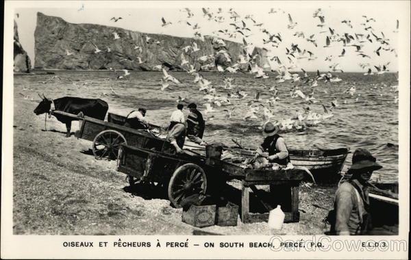 Front: OISEAUX ET PÊCHEURS À PERCÉ ON SOUTH BEACH, PERCÉ, P.Q. AR E.L.D.3. Back: Published by H. V. Henderson, West Bathurst, N.B. Canada. Made in England. "All Rights Reserved' 8/18/31 @ CARTE POSTALE CARD