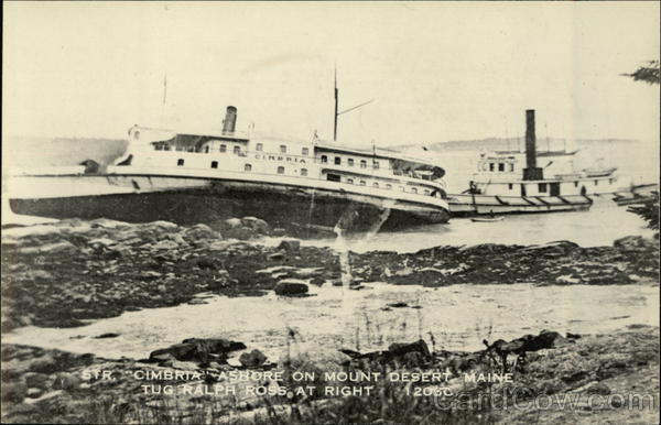 Front: CIMBRIA STR. CIMBRIA ASHORE ON MOUNT DESERT MAINE TUG RALPH ROSS AT RIGHT 2060 Back: BARBOUR LINE Genuine DEVOLITE PEERLESS O20qd EASTERN ILLUSTRATING & PUBLISHING CO., BELFAST, MAINE ALL REPRODUCTION RIGHTS RESERVED 1882-1922 SH-1677