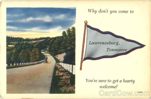 Front: Why don't you come to Lawrenceburg, Tennessee You're sure to get a hearty welcome! K7469 Back: ACOLOURPICTURE" PUBLICATION
