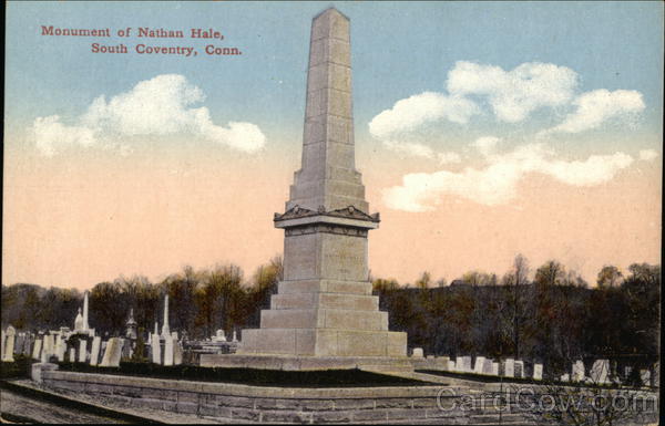 Front: Monument of Nathan Hale, South Coventry, Conn. Back: 20 5865 Published by J. S. Champlin, South Coventry, Conn. GMCCO 355950 Made in Germany.