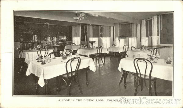 Front: A NOOK IN THE DINING ROOM, COLONIAL INN Back: $10- WEST HAVEN, CT. HAVEN, 1915 Coun Miss Margie Thompson Suffield dance Saf- inqua бар Having a great teire masquerade dance hope you will have a A.Y good time too - hove to your Mottier Lolla