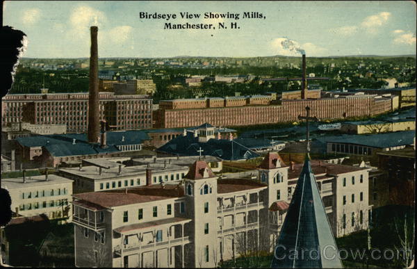 Front: accccco SOCCES 11. 1411 111 Birdseye View Showing Mills, Manchester, N. H. NEVE GAL TINH WITH Back: Chamber of Commerce Series, Manchester, N. H. For Correspondence only OST ARD For Address only