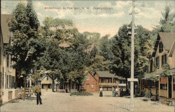 Front: BROADWAY, ALTON BAY, N H. CAMPGROUND Back: S 872161 PUBLISHED IN GERMANY FOR W. P. EMERSON, ALTON BAY, N. H. 500 POST CARD. #124 Char, & Emma, 16 N. Mire Charlotte Wright Miss Georgetone Mass,