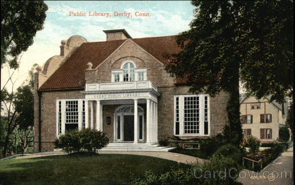 Front: Public Library, Derby, Conn. DERBY PUBLIC LIBRARY 202,776. V Back: The Valentine & Sons' Publishing Co.. Ltd., New York SOUVENIR POST GARD 4=