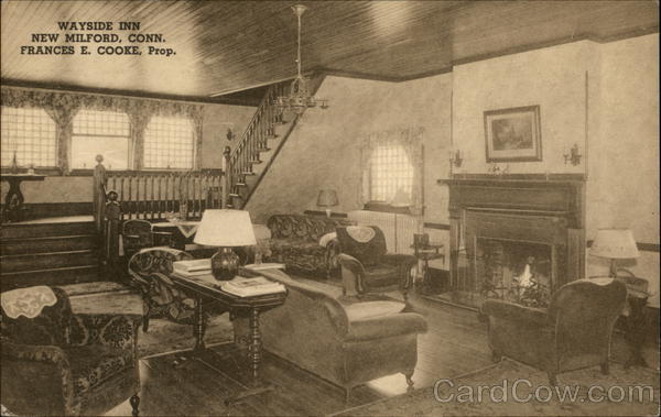 Front: WAYSIDE INN NEW MILFORD, CONN. FRANCES E. COOKE, Prop. Back: MEALS—RIGHT IN NEW MILFORD DELIGHTFULLY LOCATED — WONDERFUL Published for Edward Wells, Congers, N. Y., by Collotype Co., Elizabeth, N. J., and New York 10