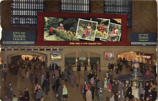 Greetings from one of the wonders of New York - The Colorama in Grand Central Station. It is a huge (18 x 60 feet) transparent color photograph, mounted above the east end of the Grand Concourse. The Colorama presents, every few weeks, a new glimpse of American life in all its color and variety. Back of it,. on the balcony, is the Eastman Kodak Photo Information center, with its fascinating display of many kinds of photography and exhibits of both early and modern photographic equipment. |