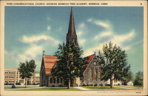 Front: PARK CONGREGATIONAL CHURCH, SHOWING NORWICH FREE ACADEMY, NORWICH, CONN. 61623 Back: MADE IN U, S. A 68 2. TICHNOR QUALITY VIEWS REG. U.S. PAT, OFF. MADE ONLY BY TICHNOR BROS., INC., BOSTON, MASS.