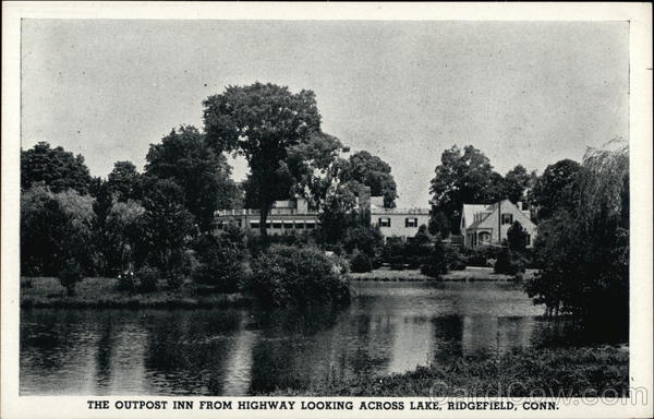 Front: THE OUTPOST INN FROM HIGHWAY LOOKING ACROSS LAKE, RIDGEFIELD, CONN. Back: PUB BY GEORGE Å. MIGNEREY, PHARMACIST, RIDGEFIELD, CONN. کے MADE IN USA