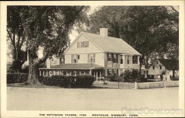 Front: THE PETTIBONE TAVERN, 1780 WEATOGUE, SIMSBURY, CONN. Back: PUBLISHED BY LATHROP PHARMACY, INC. Post Caras of Quality. - • The Albertype Co., Brookiyn, N. Y. Y-