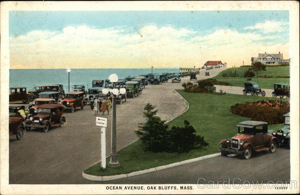 Front: OCEAN AVENUE, OAK BLUFFS, MASS. 123557 Back: PUBLISHED BY AMERICAN ART POST CARD CO., BOSTON, MASS. C. T. AMERICAN ART COLORED CH Goo HERE