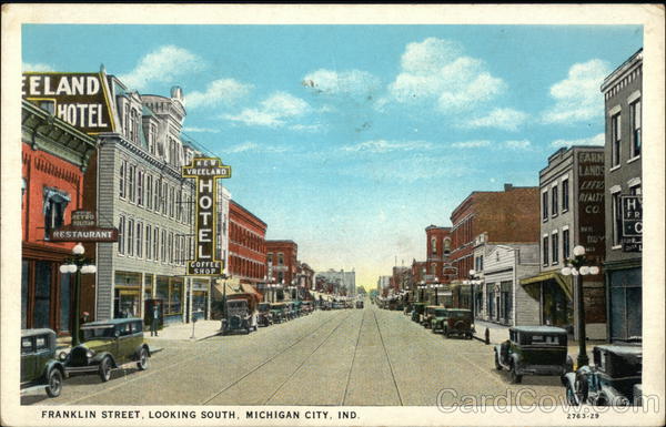 Front: EELAND ww METRO POLITAN RESTAURANT VREELAND COFFEE SHOP FRANKLIN STREET, LOOKING SOUTH, MICHIGAN CITY, IND. EE FARM LANDS ROY 2763-29 FR C Back: PUBLISHED BY GEO. LEUSCH, MICHIGAN CITY, IND. C. T. AMERICAN ART COLORED TE HERE