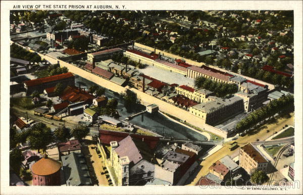 Front: AIR VIEW OF THE STATE PRISON AT AUBURN. N. Y. JARRI 思想 (C) BY EWING GALLOWAY. N. Y. Back: MFD CAME FICHNOR DUALIEY VIEWS 1,50 135574 00 THIS SPACE FOR ADDRESS ONLY