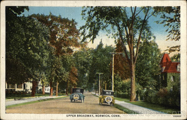 Front: UPPER BROADWAY, NORWICH, CONN. 102620 Back: autos AMERICAN ART POST CARD CO., BOSTON, MASS. WICH JUL 10 1230PM 1935 Berg муо 3. piss. AKNO FRANKLIN Japonly. 344 Lucien Cor сей Granfords 16. J.