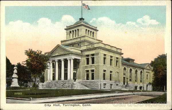 Front: 217053 City Hall, Torrington, Conn. LULE 01/ Back: PUBUSHED BY MORRIS BERMAN, NEW HAVEN, CONN QUALITY MIB SERVICE New Process-Chrom 68 Place the Stamphere and Island Possessions Cuba Canada and for foreign