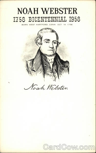 Front: NOAH WEBSTER 1758 BICENTENNIAL 1958 BORN WEST HARTFORD, CONN. OCT. 16, 1758 towy Noah Webster. Back: THIS SPACE FOR ADDRESS ONLY