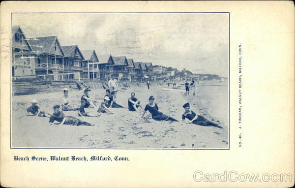 Front: Beach Scene, Walnut Beach, Milford, Conn. NO. 40. J. TINKHAM, WALNUT BEACH, MILFORD, CONN. Back: 1.907 Post Card AUG SC 49 CONN of Arr. So le Mr. William hiemes ил John A WY SERIES 1907 UNITED STAT 1706 FRANKLIN 1790 Bridgefort bom M