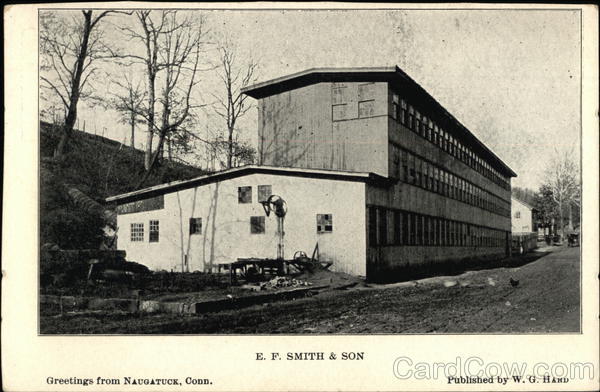 Front: Greetings from NAUGATUCK, Conn. E. F. SMITH & SON Published by W. G. HARD Back: .. Card.... (Authorized by Act of Congress of May 19, 1898) 16- "POSTAL CARD-CARTE POSTALE" 299 U.S. and Canada 1 cent. Countries 2 cents.