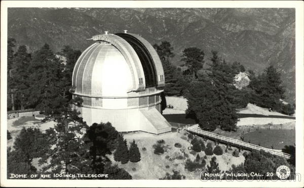 Front: DOME OF THE 100 INCH TELESCOPE MOUNT WILSON, CAL. 20 ANGE ENO CARD Back: ANGELES PHOTO POST CARD CO.,L.A. 7, CALIF.