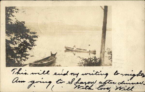 Front: This will end my writing to-nights Am going to Sharon after dinner. With Back: Real Photo Lakeville 4% POST CARD.M L99 1905 4* ONN NERENA 91 PERA 1706 FLIN1790 Miss Louise M. Crossman, Hill St.. 408-9 Ausonia, Ct. سف POSTAGE