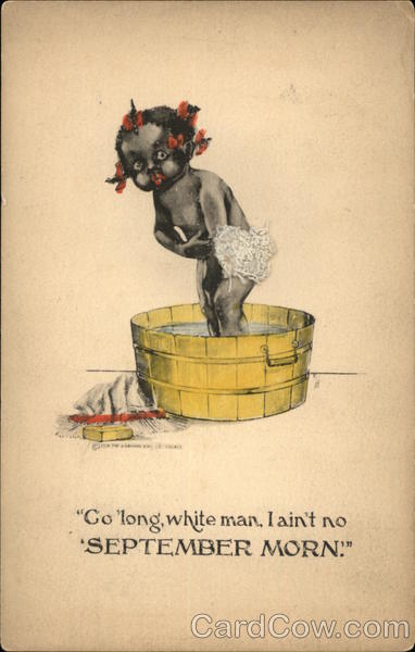 Front: © 1913 THE J RAYMOND HOWĘ, CO CHICAGO "Go 'long, white man, I ain't no 'SEPTEMBER MORN!" Back: I-ZELZ ON Dost Card ہمارا ADDRESS