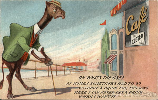 Front: COPYRIGHT 1919 BY HH ROSE. 104 Cafe CLOSED OH WHATS THE USE? AT HOME,I SOMETIMES HAD TO GO WITHOUT A DRINK FOR TEN DAYS HERE I CAN NEVER GET A DRINK WHEN I WANT IT Back: exul Here