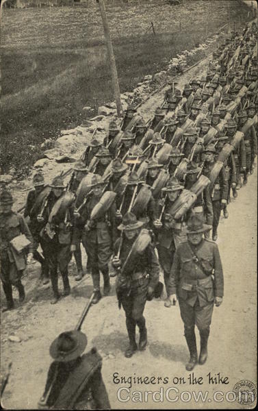 Front: Engineers on the hike CHICAGO DAILY WAR POSTALS Back: THE CHICAGO DAILY NEWS G. J. KAVANAUGH WAR POSTAL CARD DEPARTMENT U&U NAME AND ADDRESS