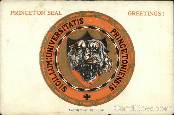 Front: SIGILLUM UNIVERSITAT PRINCETON SEAL Copyright 1907, by S. Bros. GREETINGS ! PRINGETONIENSIS Back: Mladen Bark 10- Mary Putman Com Sefert 1957 Stamp.