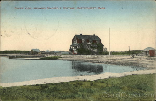 Front: SHORE VIEW, SHOWING STACKPOLE COTTAGE, MATTAPOISETT, MASS. Back: No. 66008. Published by Abner Harlow, Mattapois ett, Mass. L.N. Our You Lining ERMA & SON Faunton 75 ass. 6PM MASSS Mr. Bert Aray Middlations Mass