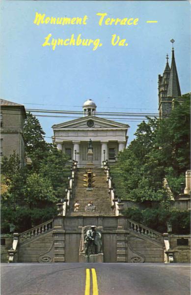 Showing Old Court House at top of hill with stone stairway approach. One of the older Virginia cities, Lynchburg was noted as a shipping point on the James River and a trading center in Ante-Bellum Days.