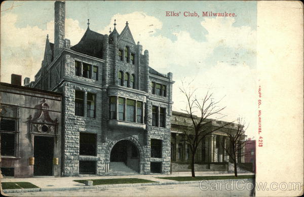 Front: Elks' Club, Milwaukee. RENZE •ROPP CO.. MILWAUKEE. 4213 Back: UK 830 Eline display of motite apparatus Velly. Convention very instructive. auto- Lucine R Churchill & # 230 Warren Ave., Brockton, Mare