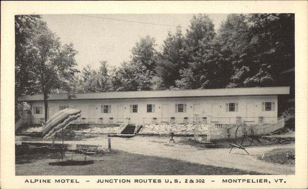 Front: 17 ALPINE MOTEL JUNCTION ROUTES U.S. 2 & 302 MONTPELIER, VT. Back: NATIONAL PRESS, INC., NORTH CHICAGO HERE