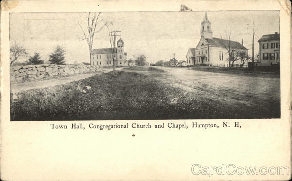 Front: 111 Town Hall, Congregational Church and Chapel, Hampton, N. H, Back: 1.23 Mis Robert I Scott St. со Beverly, SERIES 1902 UNITED STATES OF AMERICA 1706 FRANKLINT 1790 так