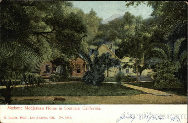 Front: ALA Madame Modjeska's Home in Southern California. M. Rieder, Publ., Los Angeles, Cal. No. 3504. July 8 €/904. H3. AB. Back: Miss. A. E. Bacon 183 N. Lakr Air Pasadena Cal