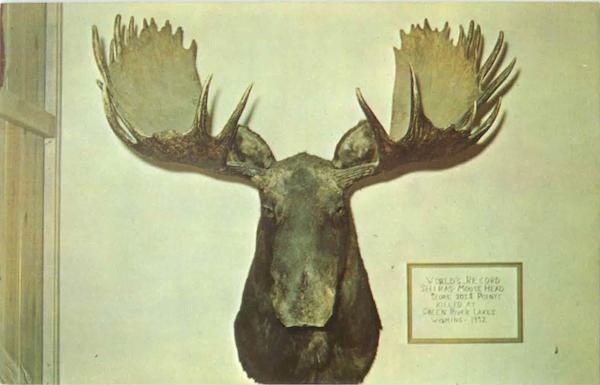 This World's Record Moose was killed at Green River lakes, Wyoming, in 1952 by John M. Oakley. Official Scoring System for North American Big Game Trophies. Present owner: Jackson Hole Museum, Jackson, Wyoming.