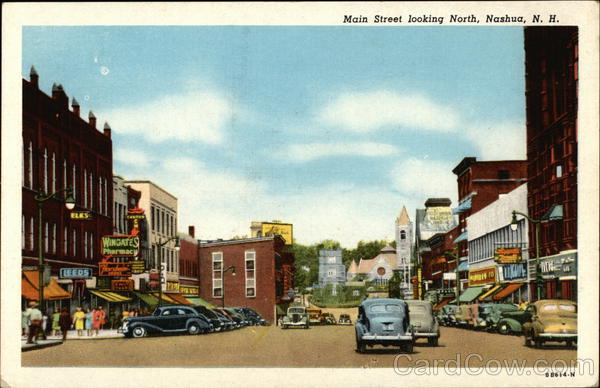 Front: Main Street looking North, Nashua, N. H. ELKS NASHLAY Kack WINGATES Pharmacy EEDS lorshein- 肉 rO 8 B614-N Back: G, C. PRINCE & SON, INC., LOWELL, MASS,