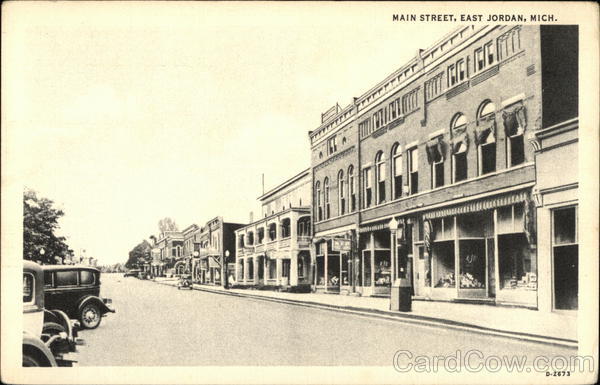 Front: MAIN STREET, EAST JORDAN, MICH. D-2673 Back: 75 "c. T. PHOTO.PLATIN”, MADE ONLY BY CURT TEICH & Co., INC., CHICAGO, U.S.A. GIDLEY & MAC, EAST JORDAN, MICH.