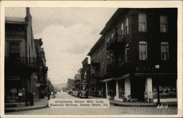 Front: WINNE STEVENSON Allegheney Street Mile Long Business Section, Jersey Shore, Pa. 6014 Back: Silvercraft—Made by Dexter Press, Pearl River, N. Y.