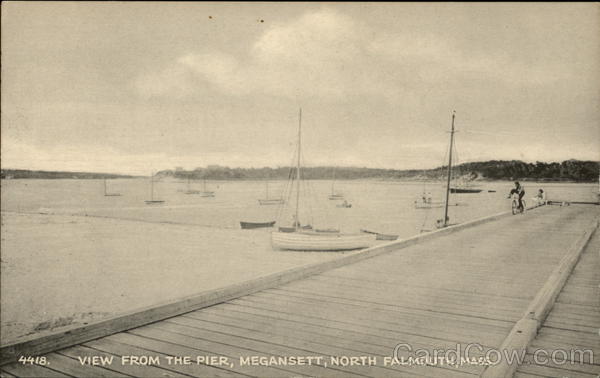 Front: 4418. VIEW FROM THE PIER, MEGANSETT, NORTH FALMOUTH,MASS. Back: WESCO PRINT A9 Pub. by E. D. West Co., S. Yarmouth, Cape Cod, Mass.