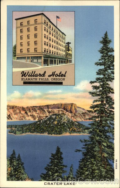 Front: Willard Hotel KLAMATH FALLS, OREGON CRATER LAKE 9A-H356 Back: 1.50 Shortest and fastest route to CRATER LAKE America's outstanding scenic trip, Highway 97