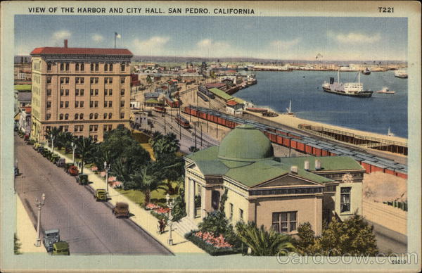 Front: VIEW OF THE HARBOR AND CITY HALL, SAN PEDRO, CALIFORNIA T221 பாய E BR 64210 Back: MADE IN U. S. A tichnor art company, L. A.
