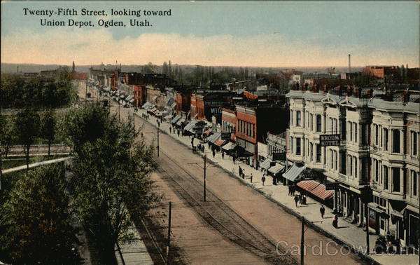 Front: Twenty-Fifth Street, looking toward Union Depot, Ogden, Utah. BROOM Back: PUBLISHED BY THE GRAY NEWS CO., SALT LAKE CITY, UTAH. tot A-7947 T: PHOTOCHROM DOST THIS SPACE FOR ADDRESS ONLY.