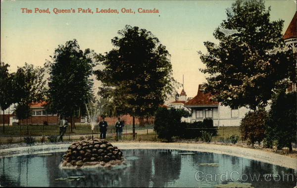 Front: The Pond, Queen's Park, London, Ont., Canada 107.2 84. Back: Montreal and Toronto The Valentine & Sens Publishing Co., Ltd. FAMOUS VA & SONS CARD THROUGHOUT THE WORLD BRITISH MANUFACTURE