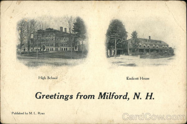 Front: GOT High School 107 Published by M. L. Ryan Endicott House Greetings from Milford, N. H. Back: New England Stationery Co, Boston, Mass. (For Correspondence Only; (For Aadress Only: Piace Stamp and Island Cuba, Canada and Mexico Two Cents