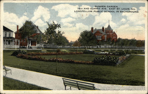 Front: SUNKEN GARDEN. 14TH AND SUMMIT AVE.. EAST ST. LOUIS, ILL. LONGFELLOW PUBLIC SCHOOL IN BACKGROUND. Back: 43341-PUBLISHED BY ST. LOUIS NEWS COMPANY, INC., ST. LOUIS, MO. COMMERCIALCHROME al PLACE