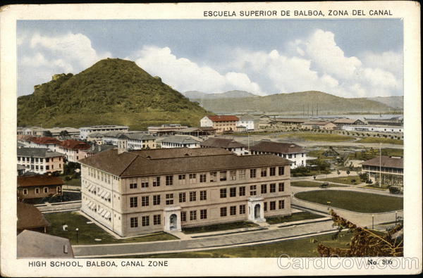Front: ㅁㅁㅁ TIN תאות HIGH SCHOOL, BALBOA, CANAL ZONE ESCUELA SUPERIOR DE BALBOA, ZONA DEL CANAL HAREN137 No. 306 Back: I. L. MADURO. JR., 34-46 CATHEDRAL SQUARE, PANAMA FOR MESSAGE ONLY TWO CENTS